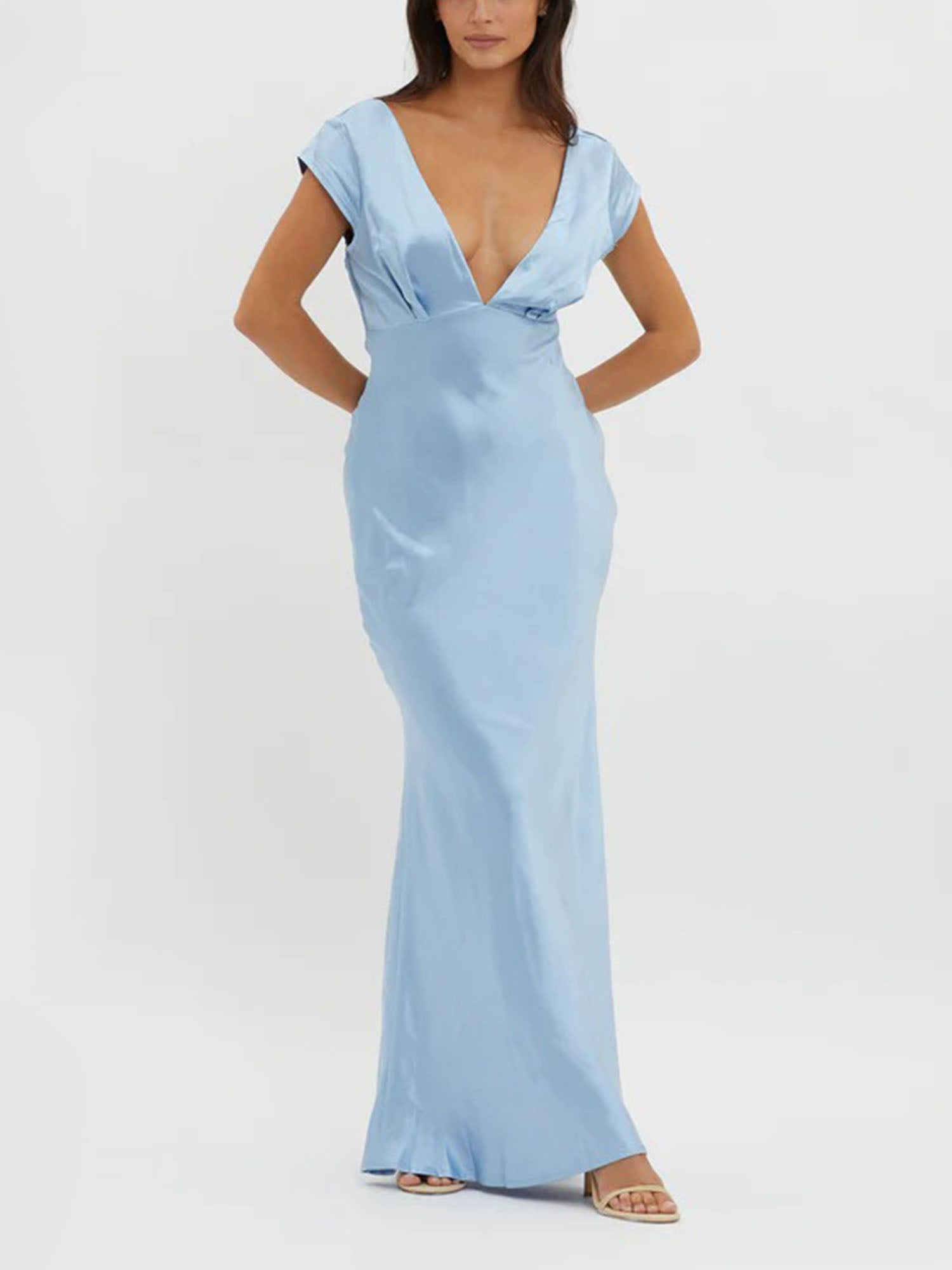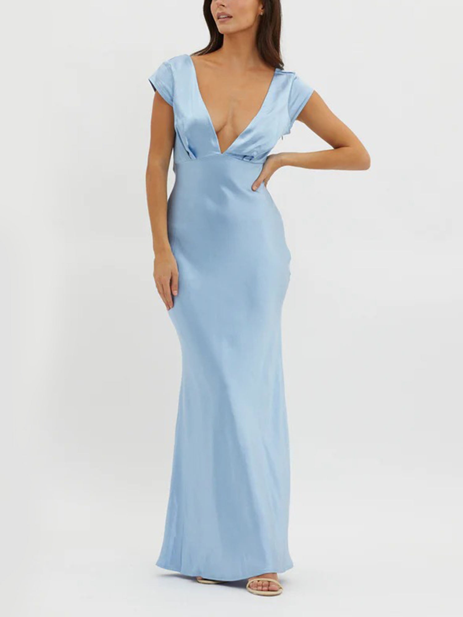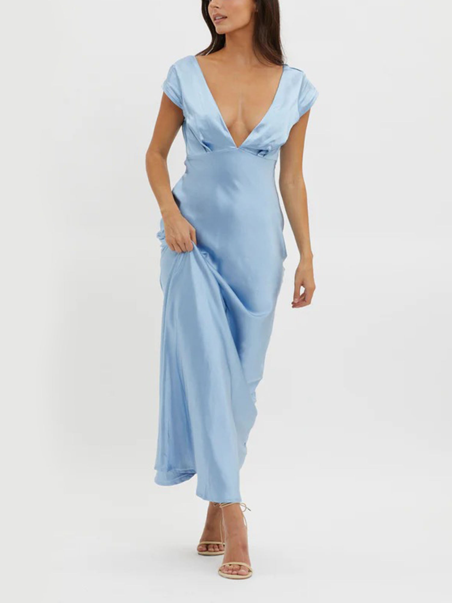 "Sky Satin" Plunge V-Neck Maxi Dress