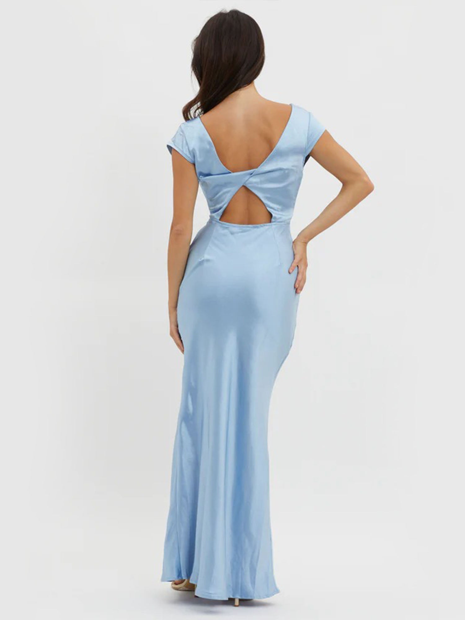 The luxe liquid satin fabric drapes beautifully in a soft sky blue hue, creating a shimmering, fluid silhouette that hugs your figure. The plunging V-neckline and cap sleeves add a sophisticated allure, while the floor-grazing length ensures a red-carpet-ready look.
