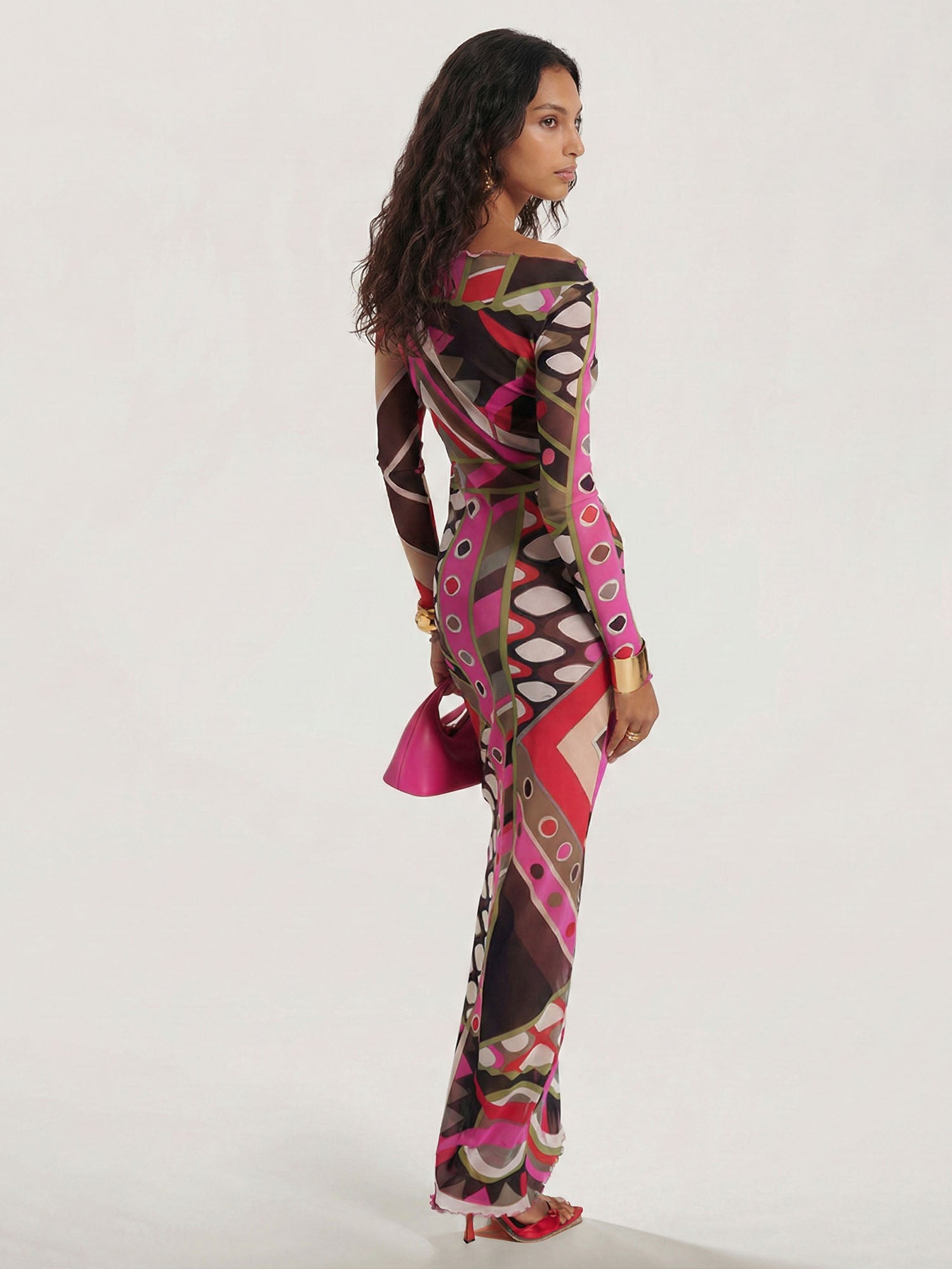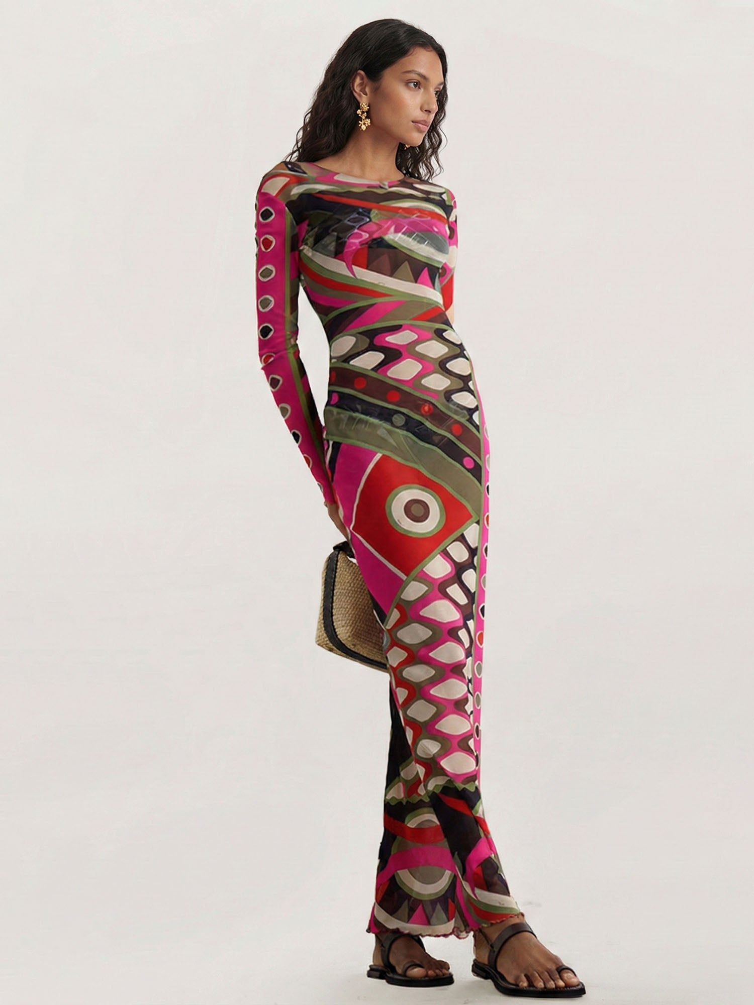 It features a sleek boat neckline, fitted long sleeves, and a bodycon silhouette that hugs the figure before falling to a floor-grazing hem. The bold retro print—composed of geometric shapes, circular motifs, and stylized snake patterns—adds a playful, eye-catching touch, making it ideal for after-dark events, bold outings, or any occasion that calls for head-turning style.