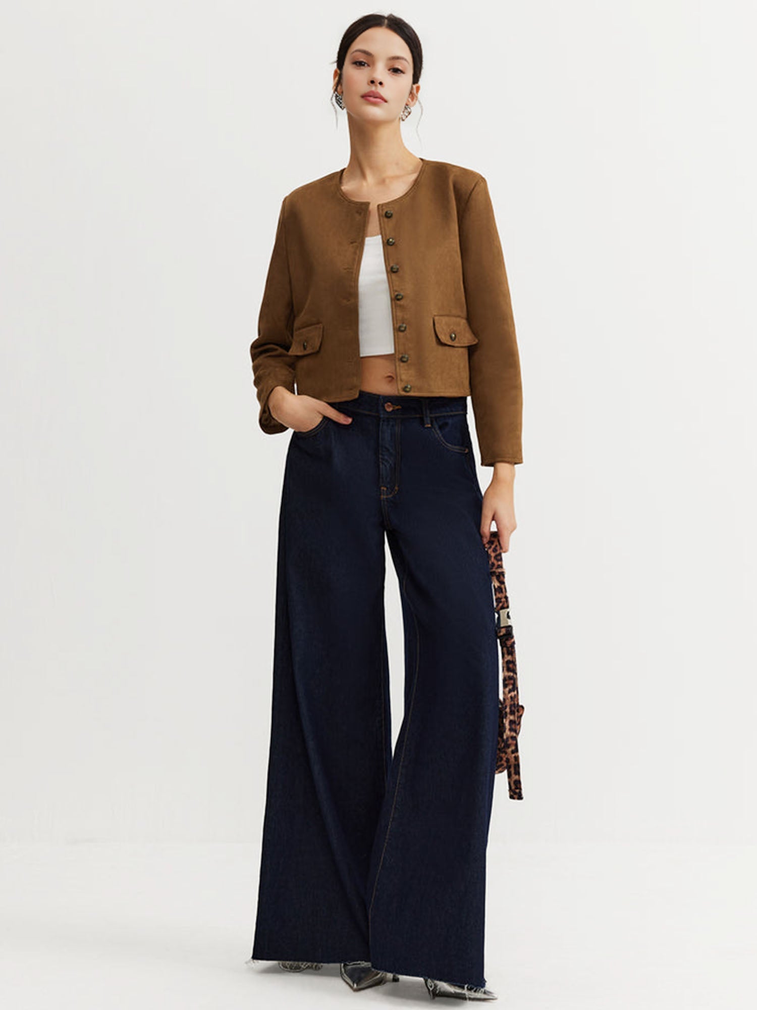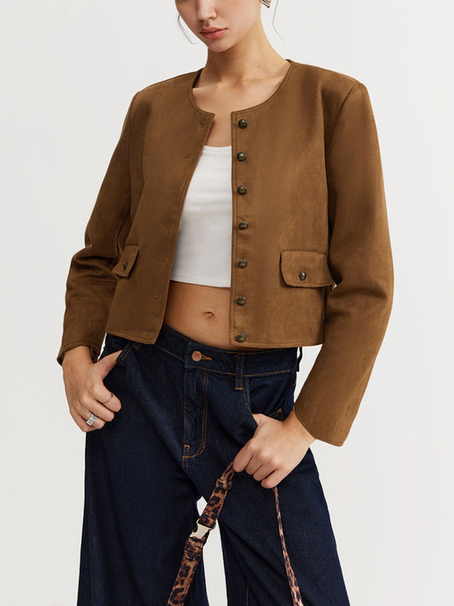 The soft faux suede fabric offers a luxe, tactile feel in a warm camel hue, creating a polished, autumnal vibe. The minimalist collarless design and vertical button placket add a sleek, tailored touch, while the patch pockets enhance functionality and style.
