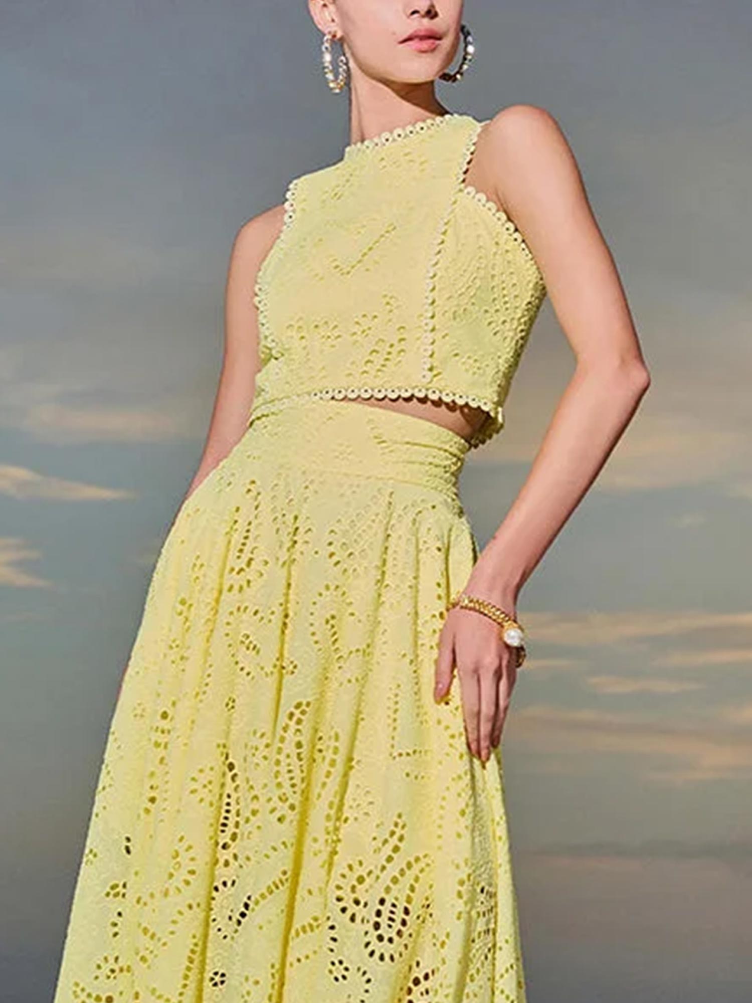 The cropped high-neck top highlights your waistline, while the flowy maxi skirt with side pockets offers both elegance and practicality....