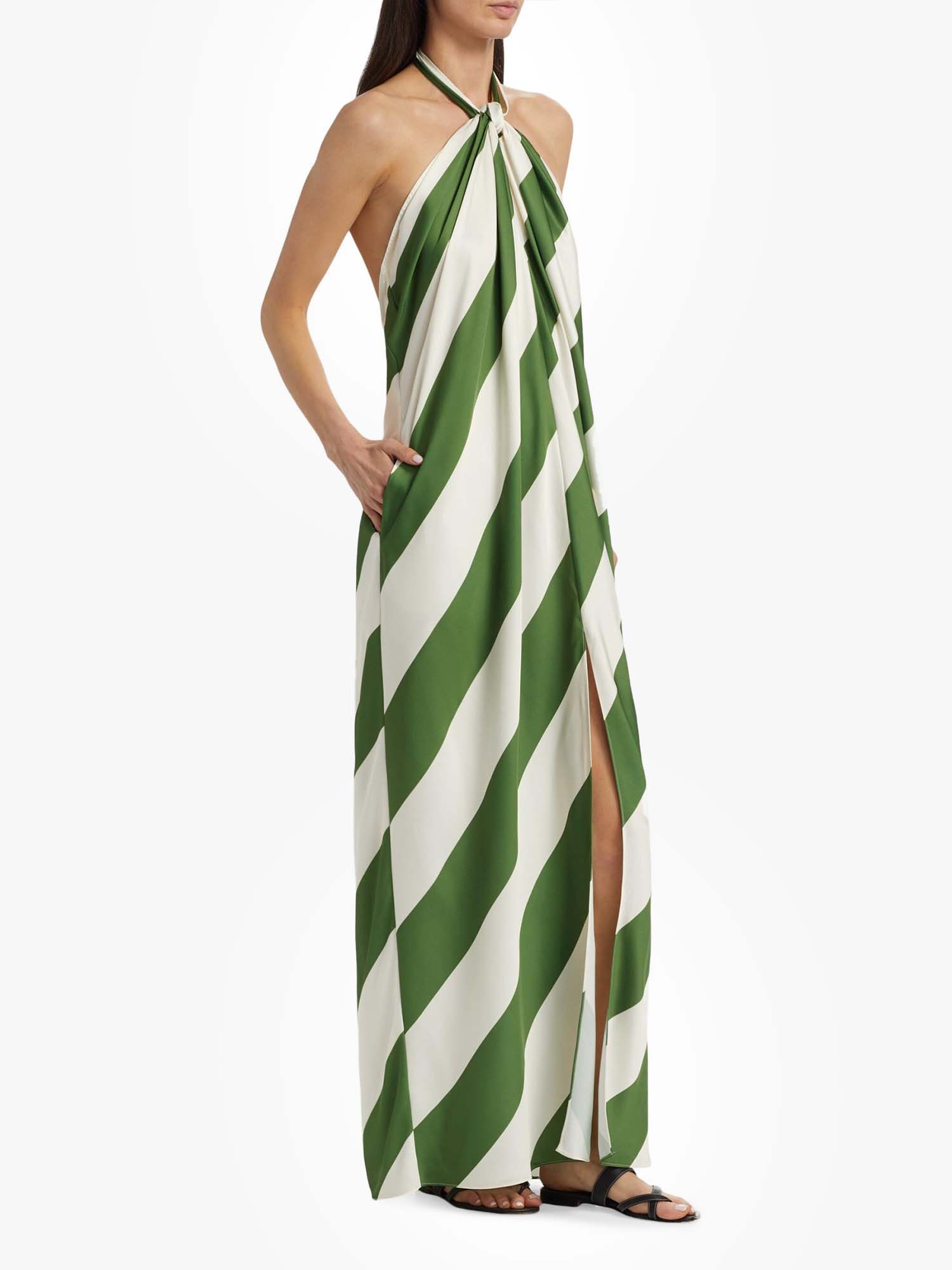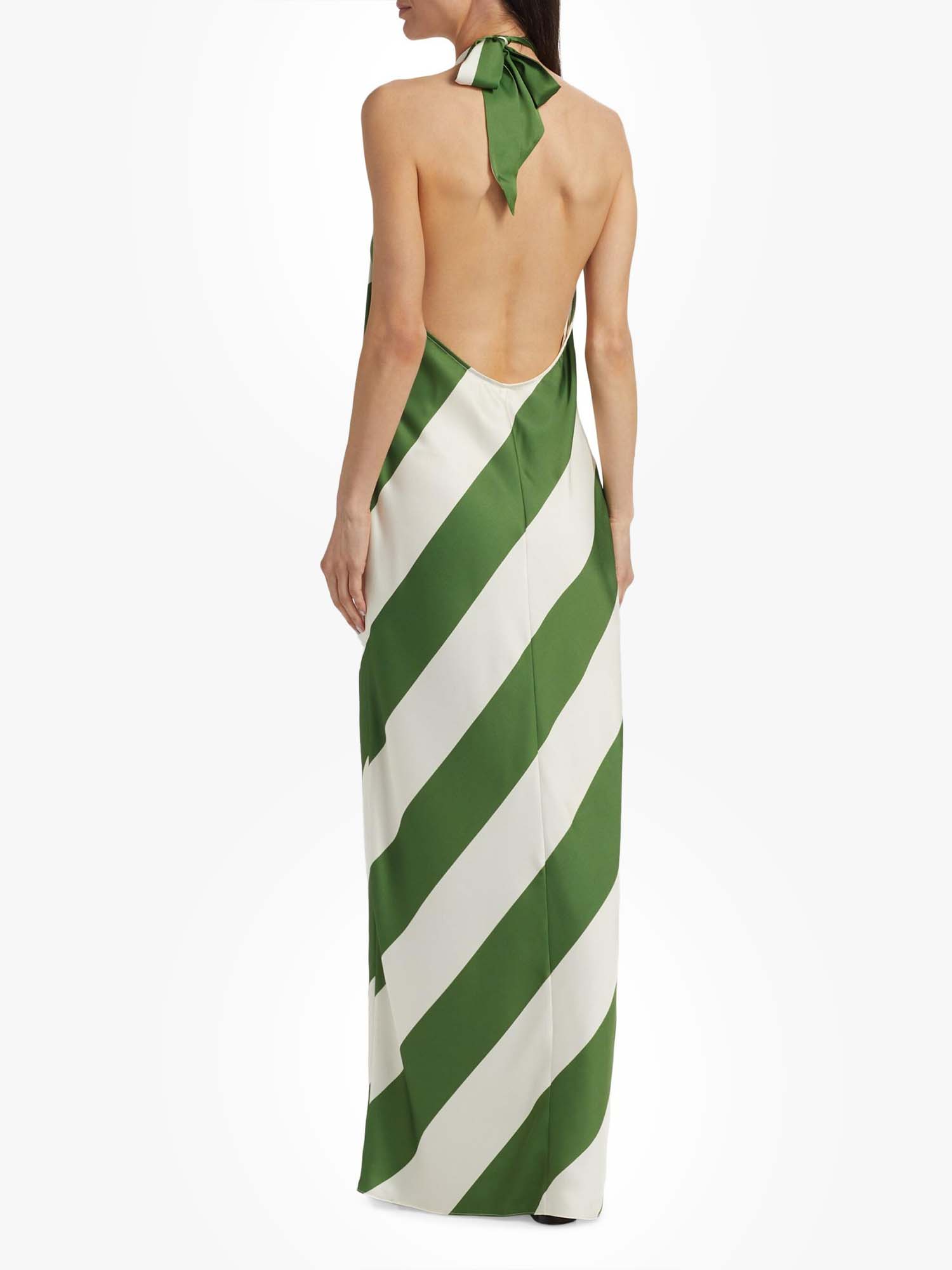The lightweight, fluid polyester satin fabric features a striking diagonal stripe pattern in vibrant green and classic ivory, creating a modern, eye-catching effect. The twisted halter neckline and open back add a sophisticated allure, while the flowy, wide-leg-style skirt ensures comfort and movement. Functional side pockets add practicality to this chic design.