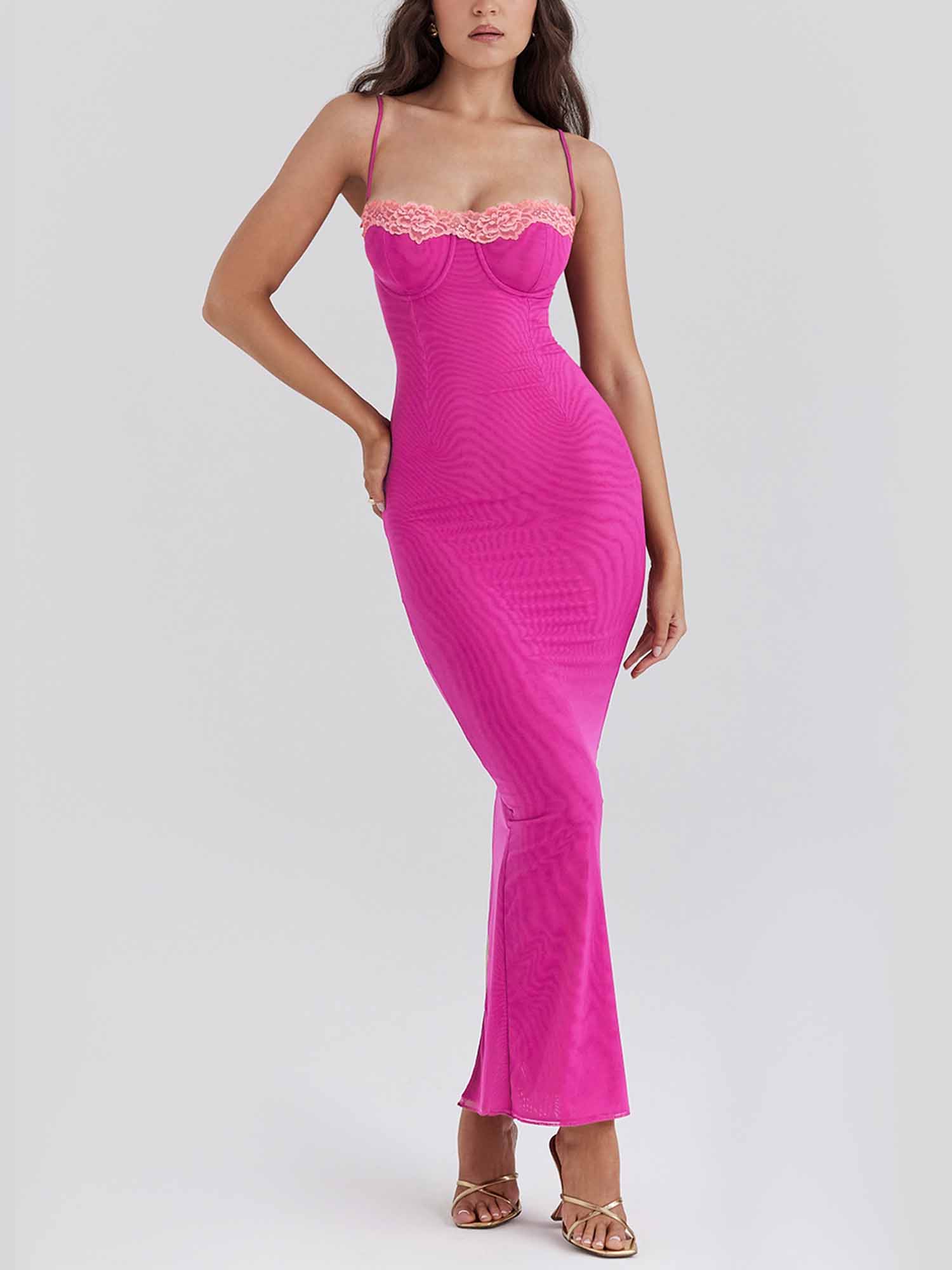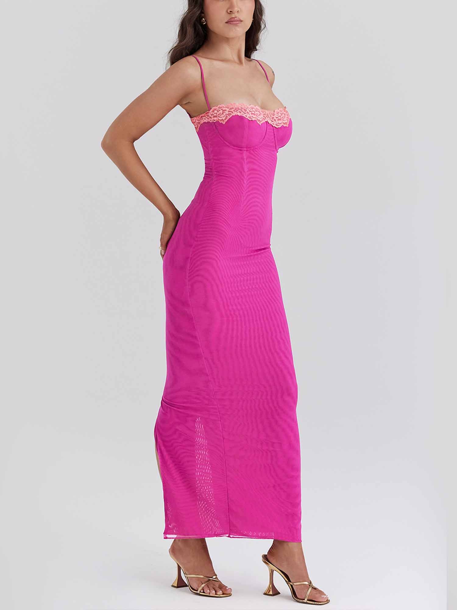 It features delicate pink lace trim along the bustline, thin spaghetti straps, and a form-fitting silhouette that hugs the body. The maxi length grazes the ankles, with a subtle side slit for movement, making it ideal for date nights, cocktail parties, or special evening occasions.