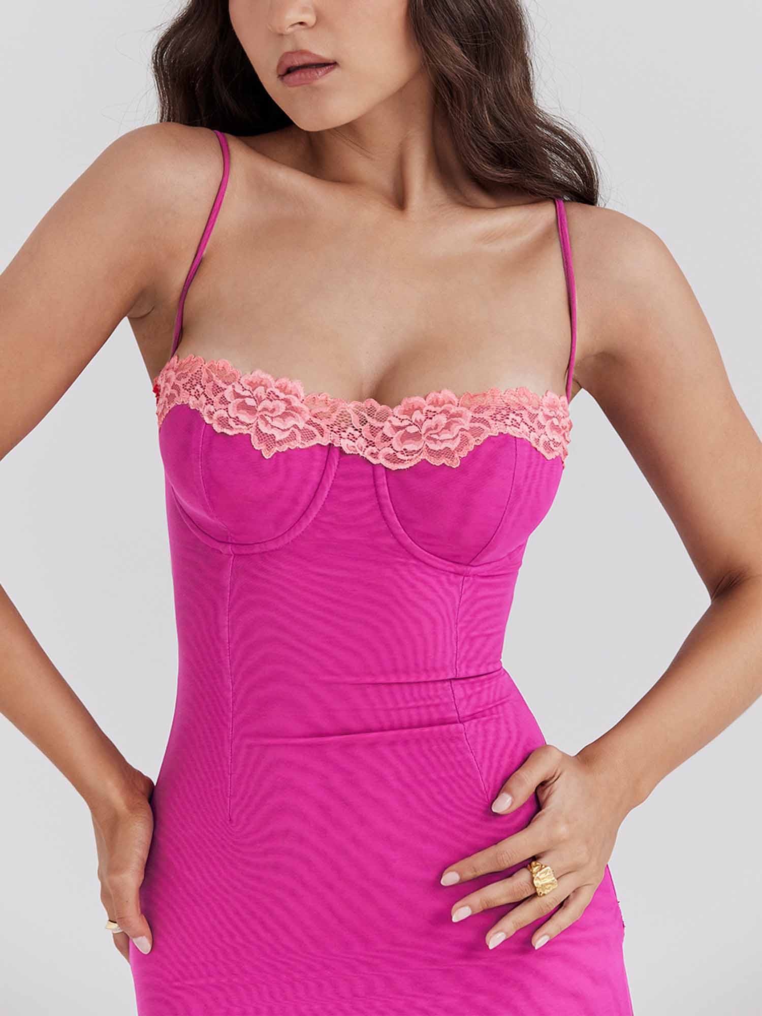 It features delicate pink lace trim along the bustline, thin spaghetti straps, and a form-fitting silhouette that hugs the body....