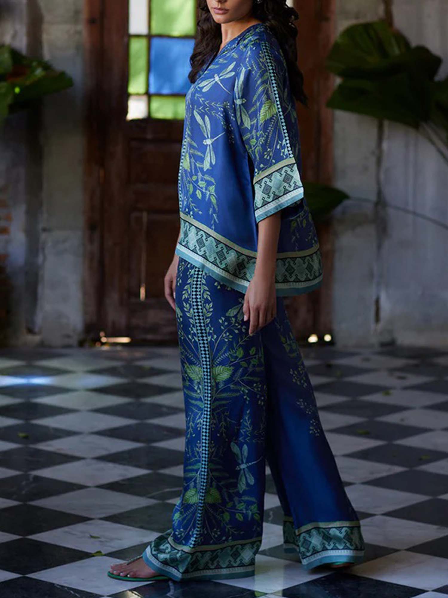 The lightweight, fluid polyester fabric is adorned with a delicate green leaf print against a deep royal blue base, creating a striking, nature-inspired effect. The relaxed tunic shirt features a V-neckline and three-quarter kimono sleeves, while the flowy wide leg pants offer effortless movement and a flattering drape. Contrast geometric trim at the cuffs and hems adds a polished, artisanal touch.