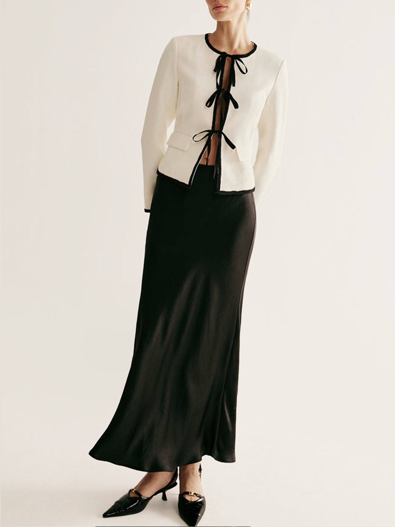 The textured woven fabric offers a structured, tactile feel in a crisp ivory hue, creating a polished, elegant vibe. The minimalist collarless design and adjustable black bow closures add a playful, customizable touch, while the contrast trim and patch pockets enhance modern appeal.