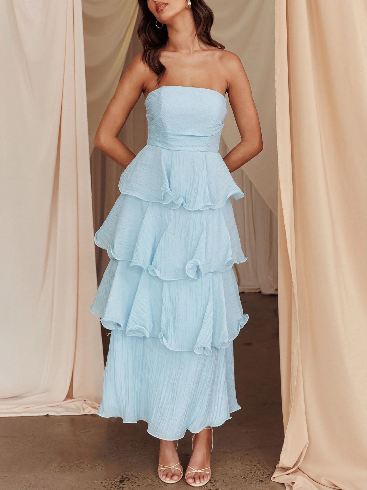 The lightweight crinkle chiffon fabric drapes beautifully in a dreamy sky blue hue, creating a flowing, airy silhouette. The strapless sweetheart neckline and ruched bodice highlight your figure, while the cascading tiered ruffles add playful movement and texture with every step.