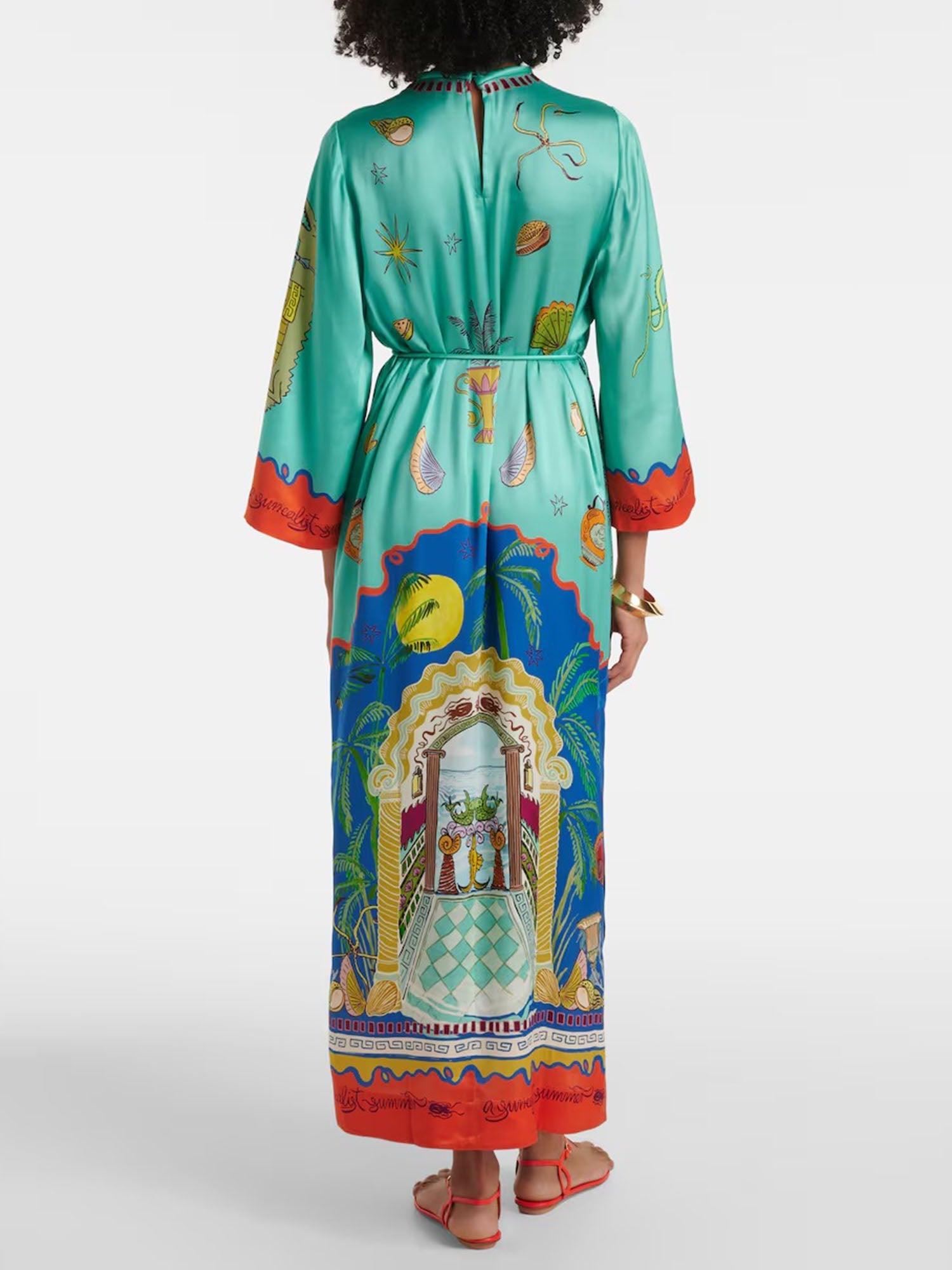 The lightweight, fluid polyester fabric is adorned with a vibrant, whimsical print, featuring a lobster, tropical foliage, and a colorful architectural portal that evokes the spirit of a Mediterranean vacation. The high neckline and flowing three-quarter sleeves create a relaxed yet elegant silhouette, while the self-tie waist belt cinches your figure for a flattering fit.