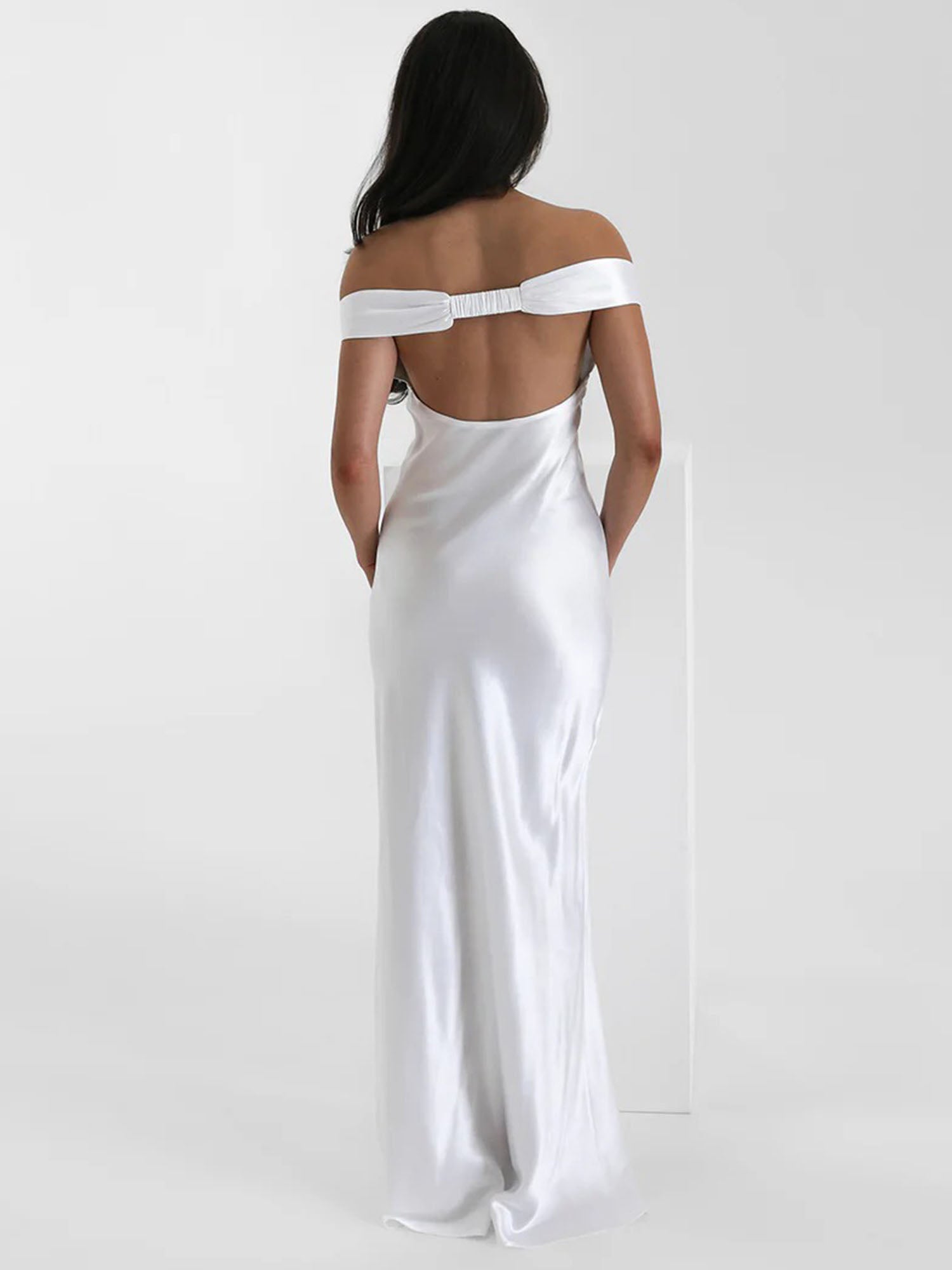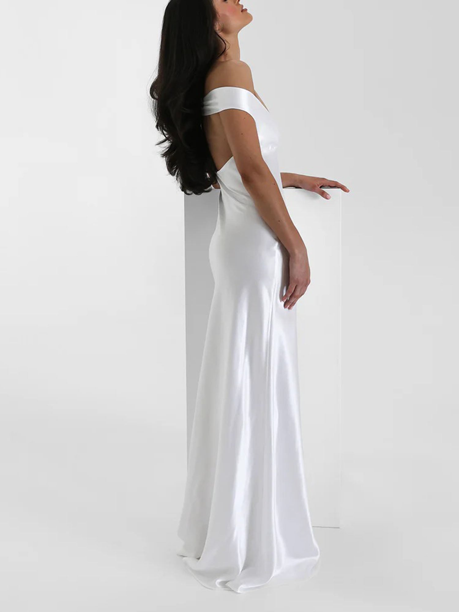 "Bridal Bliss" White Satin Off-the-Shoulder Maxi Dress