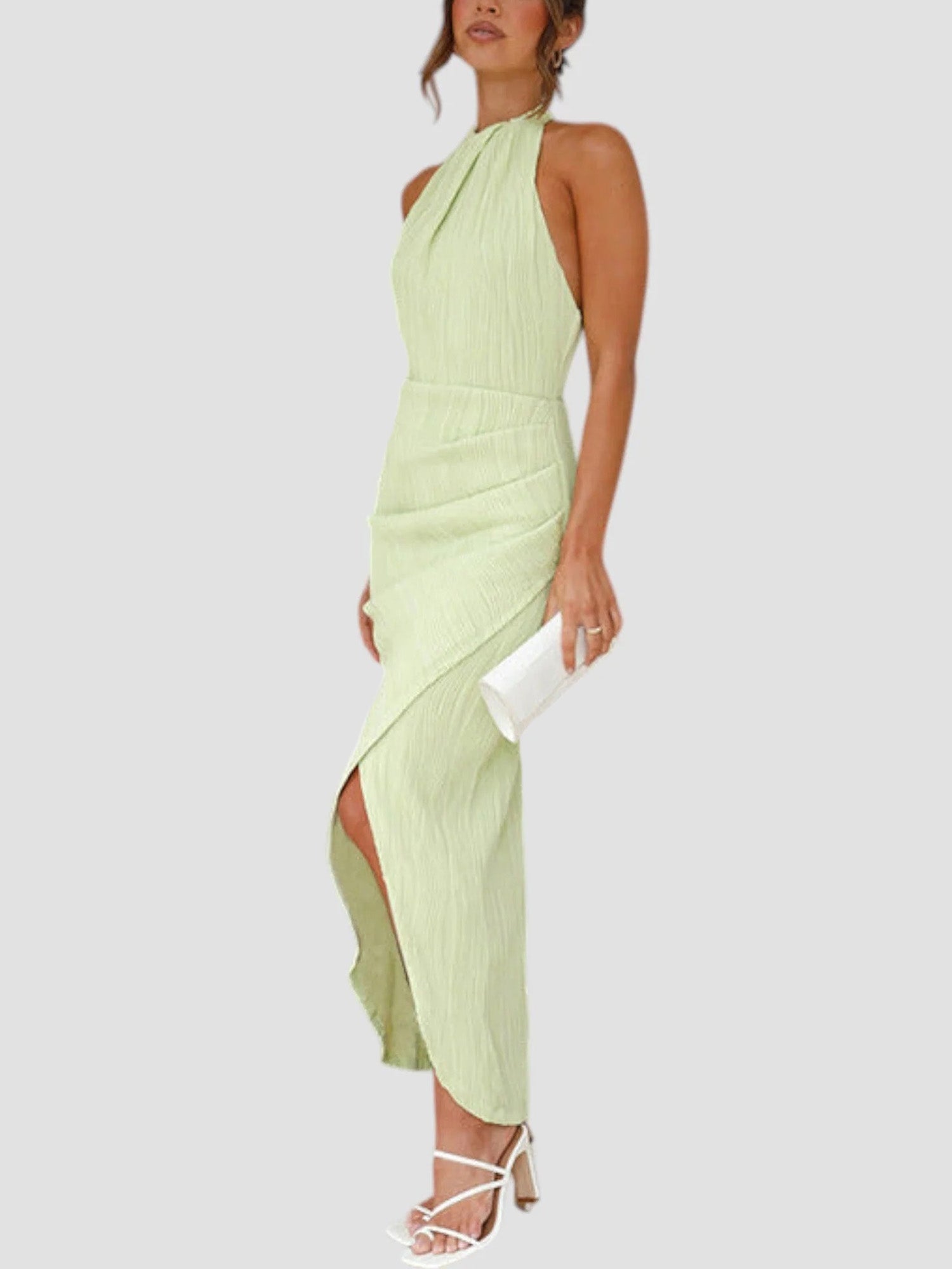 The lightweight crinkle knit fabric offers breathable comfort and a subtle ribbed texture, while the sleek halter neckline creates a polished, sophisticated silhouette. The ruched wrap skirt with a side slit adds a playful allure and ensures graceful movement with every step.
