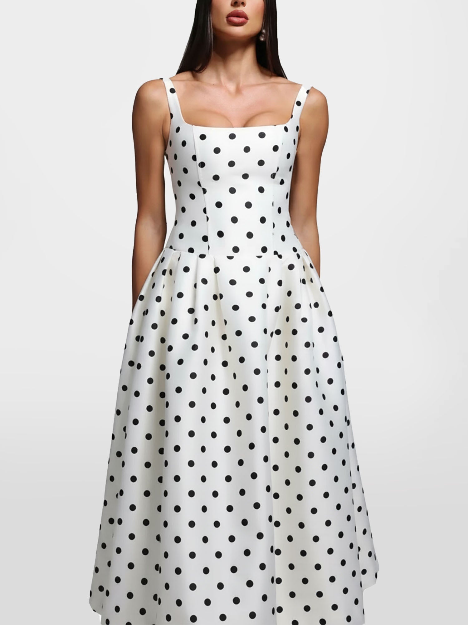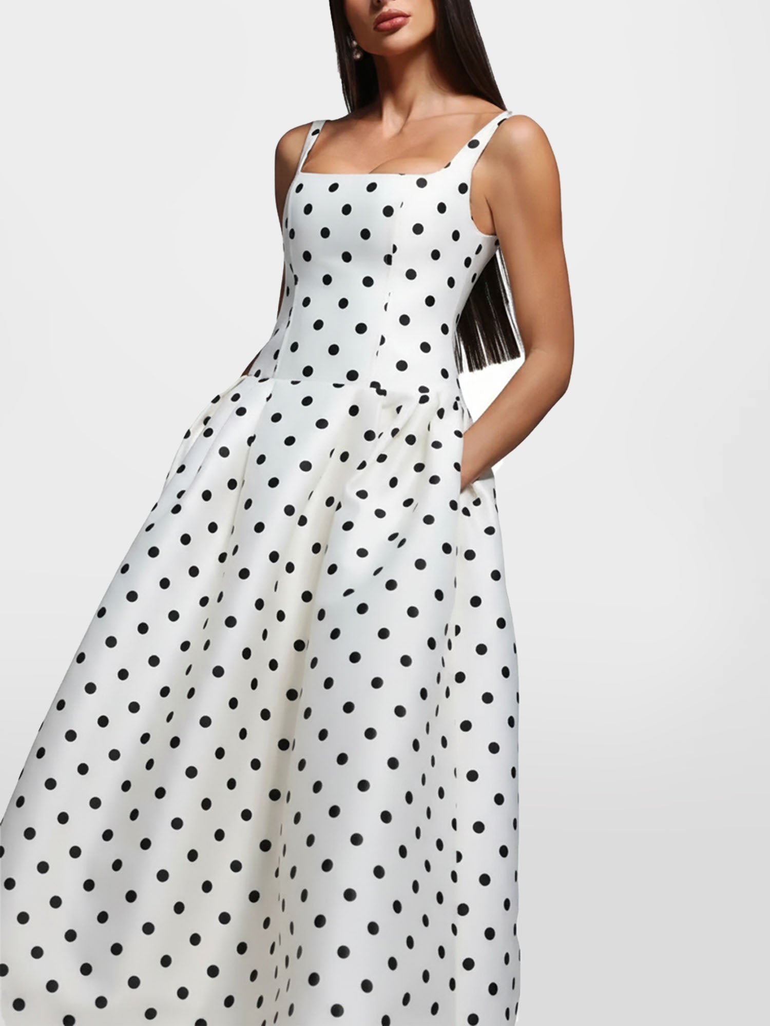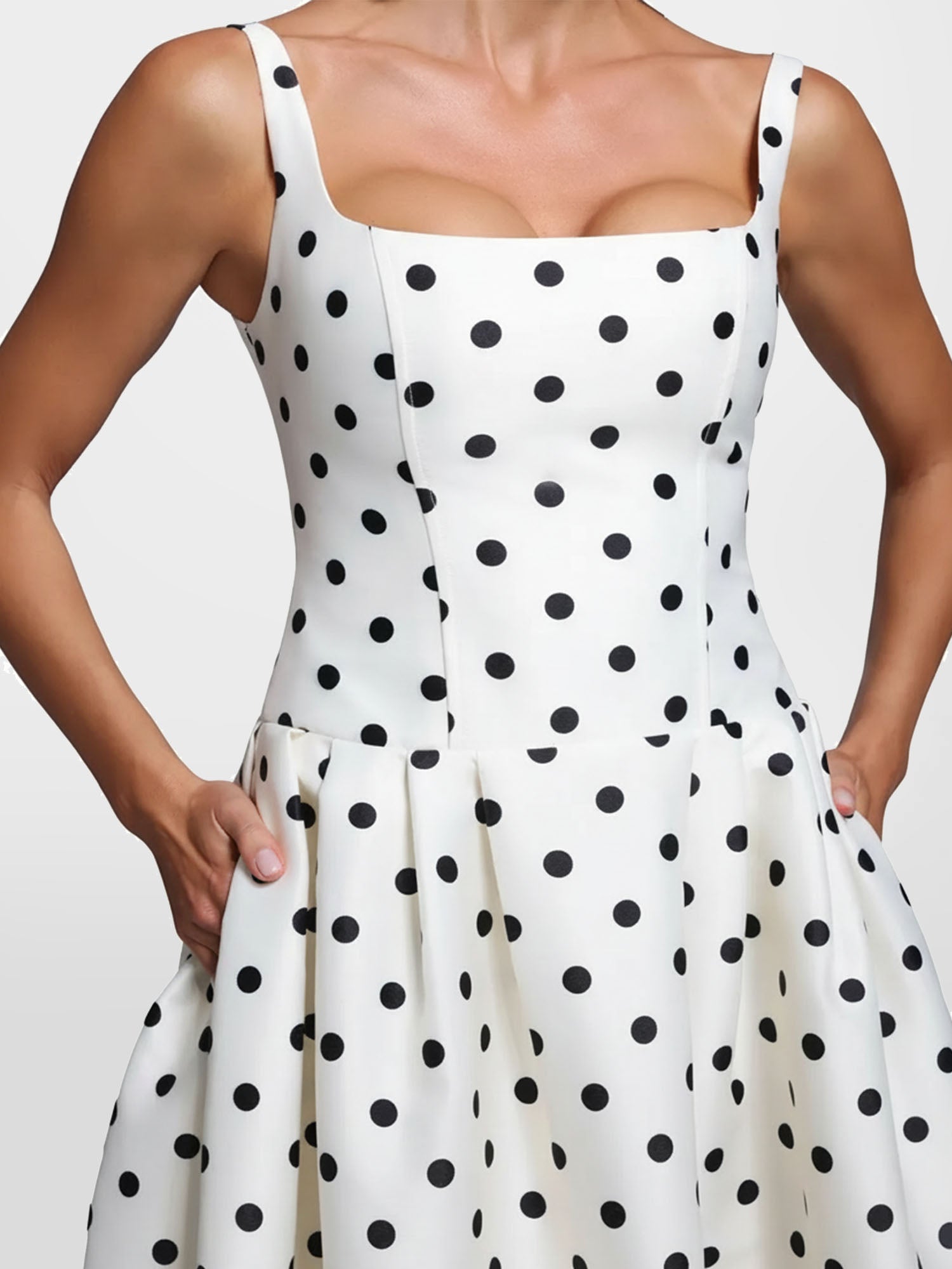 The crisp white base is adorned with a bold black polka dot print, while the structured square neckline and fitted...