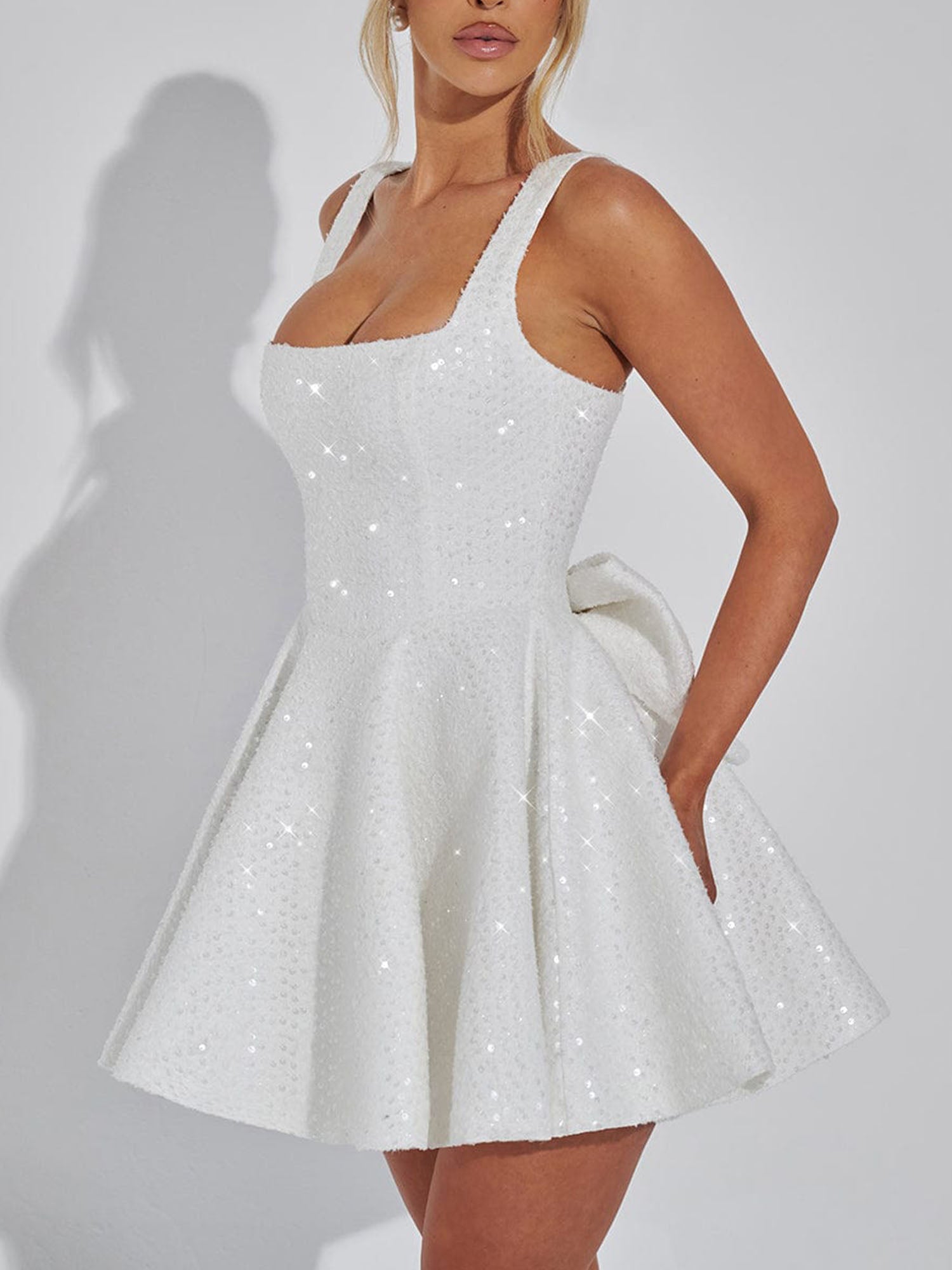 "Starlit Bow" Sequin Square Neck Mini Dress