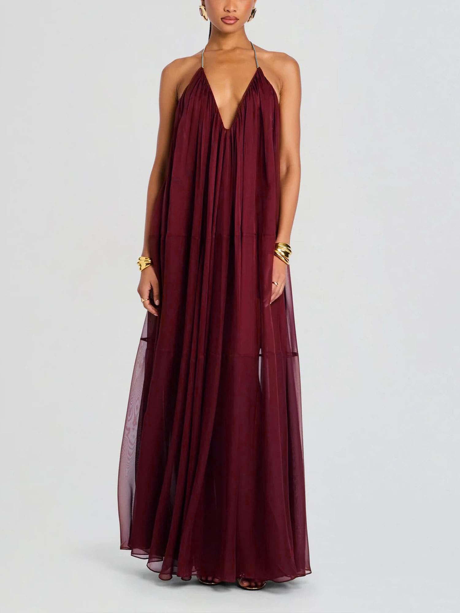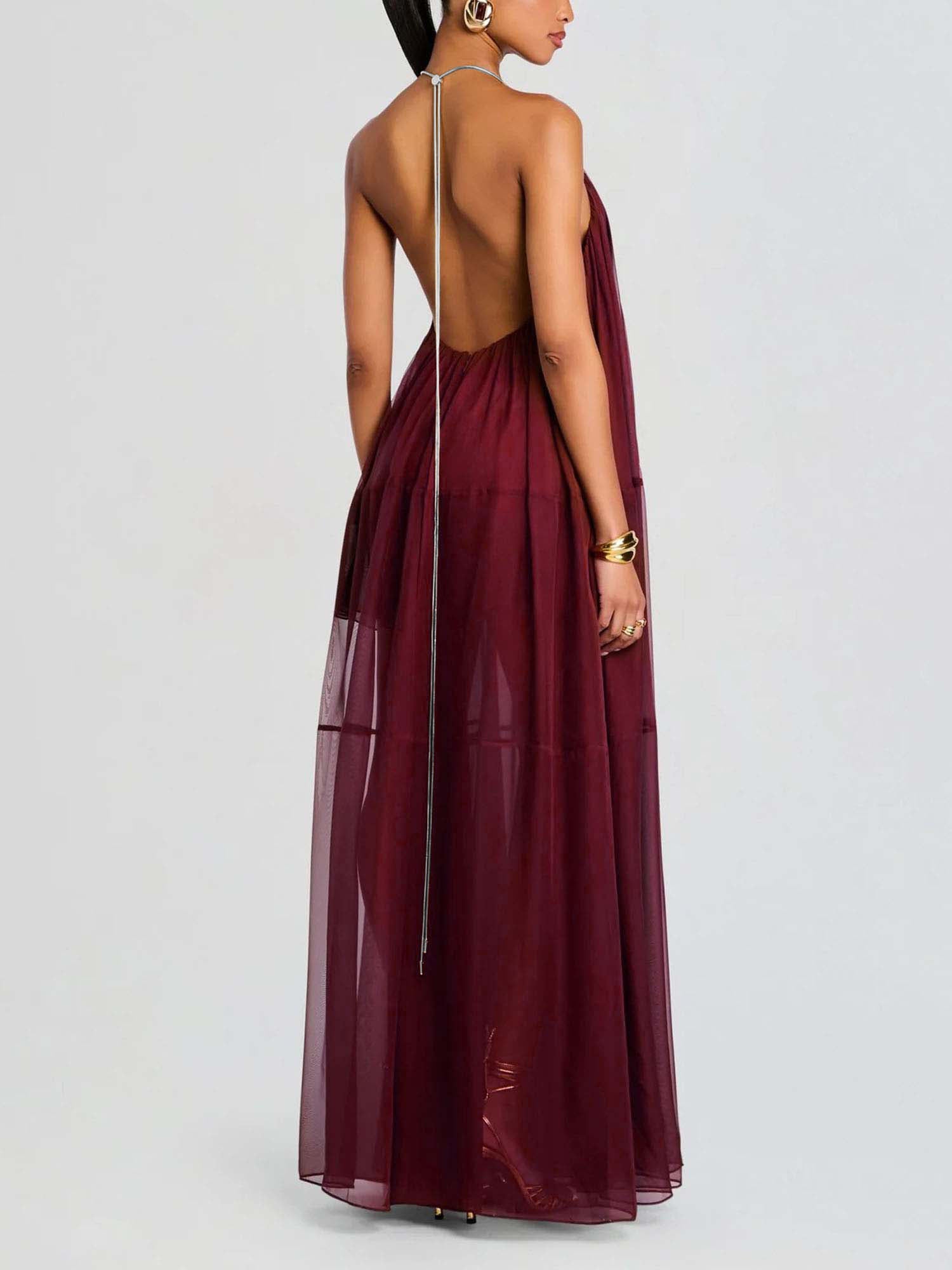 "Burgundy Breeze" Halter Neck Sheer Maxi Dress