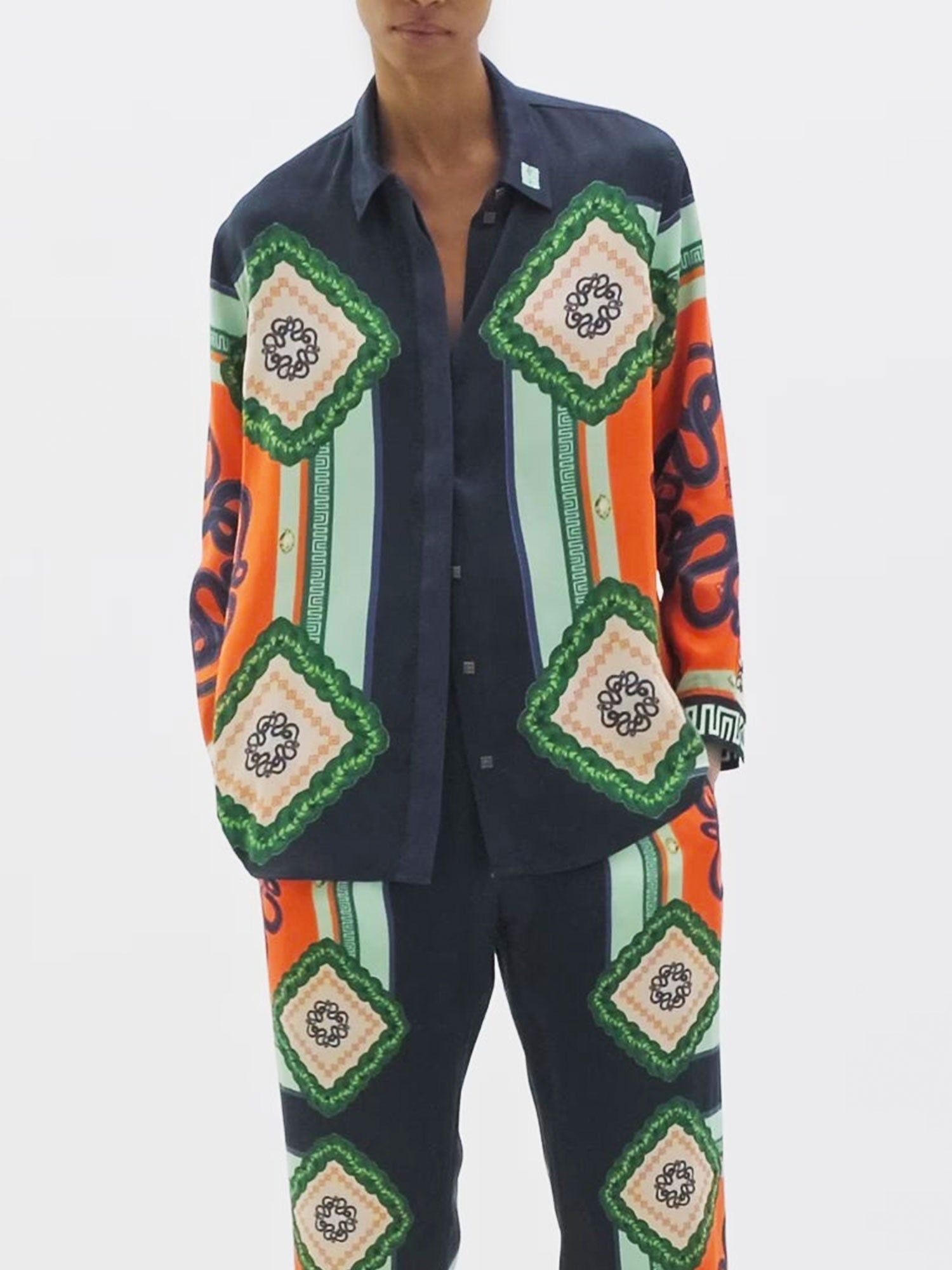 The lightweight, fluid polyester fabric is adorned with a striking geometric scarf print in contrasting hues of navy, orange, and mint green, creating a dynamic, eye-catching effect. The relaxed collared shirt and flowy wide leg pants offer effortless movement and a flattering drape, making it ideal for resort days, art gallery outings, or any occasion where you want to make a bold, artistic statement.