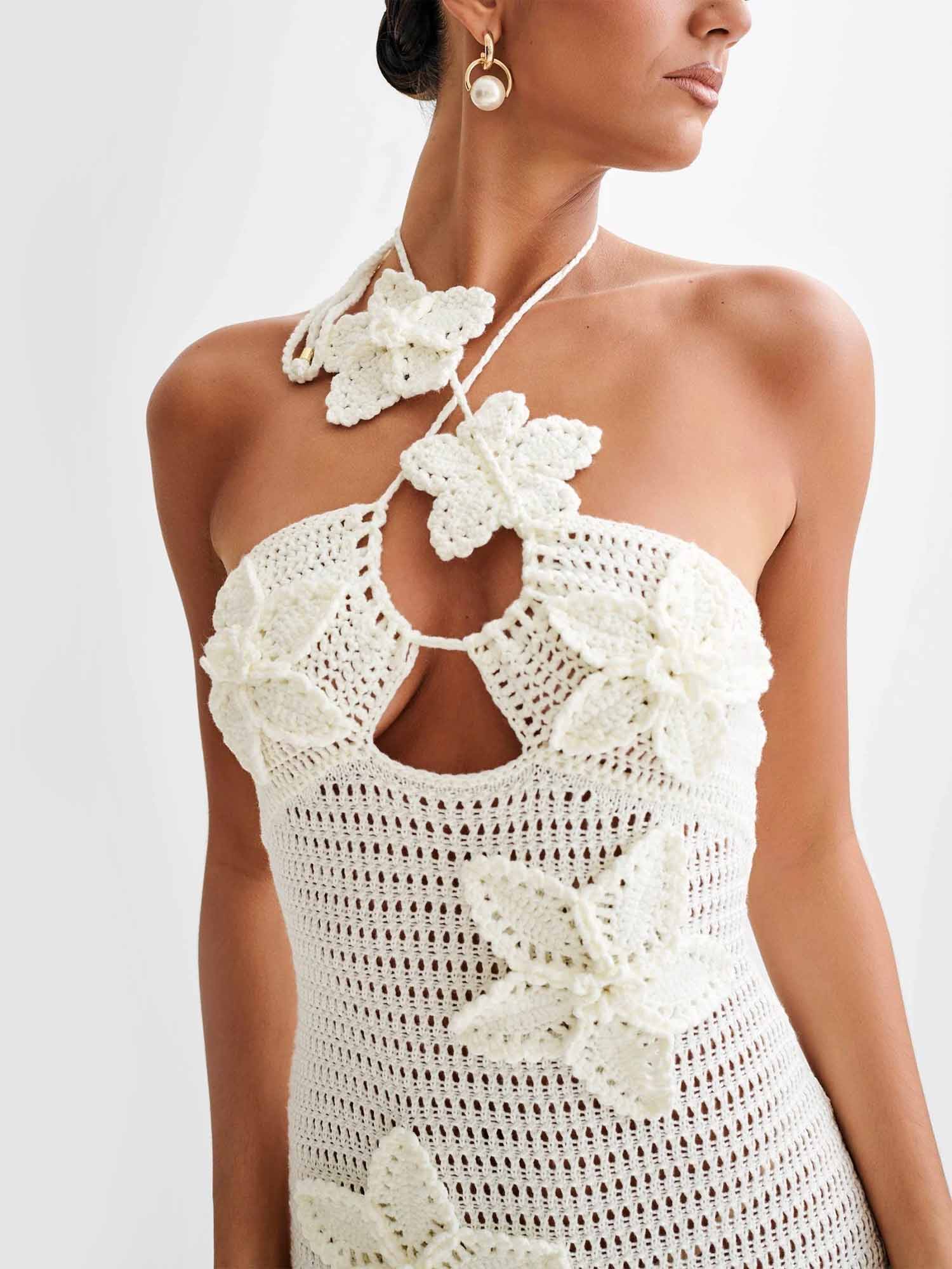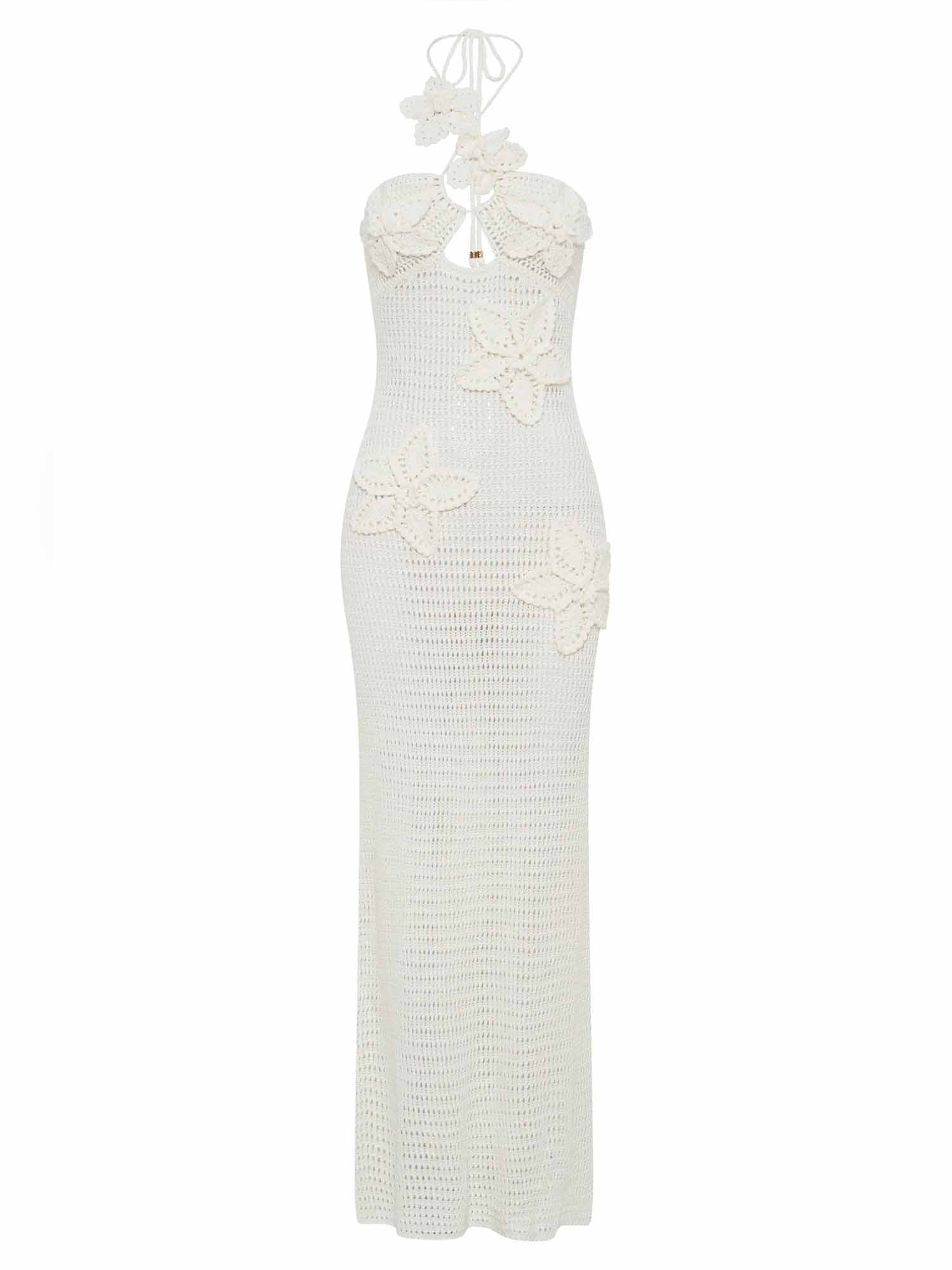 "Tropical Bloom" White Crochet Floral Halter Maxi Dress
